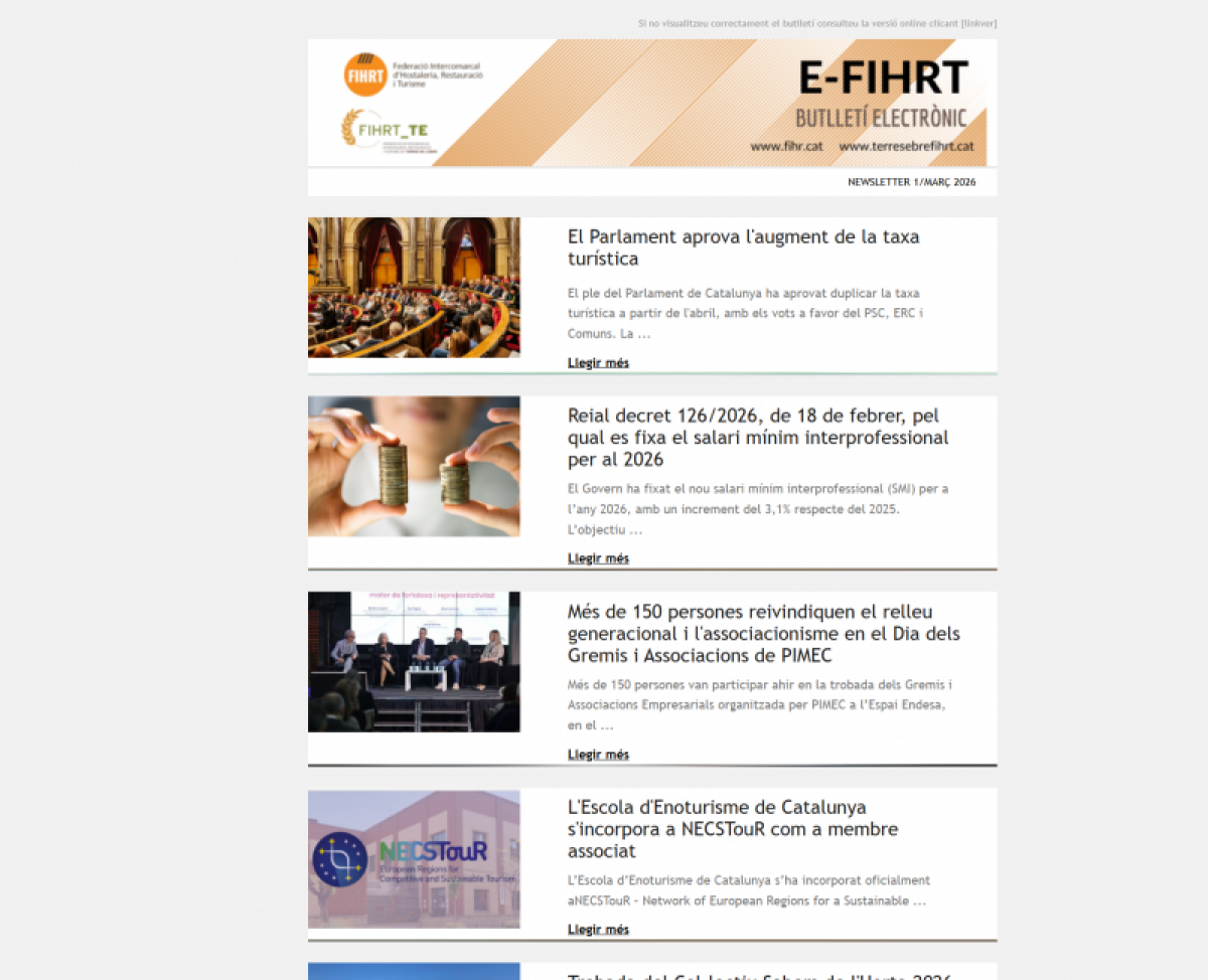 L’edició de l’E-FIHRT de l’1 de març de 2026 dibuixa amb molta claredat el moment que viu el sector: d’una banda, un teixit gremial i territorial actiu, compromès amb la qualitat, l’arrelament i la sostenibilitat; de l’altra, decisions polítiques i reguladores que impacten directament sobre la competitivitat de l’hostaleria i el turisme. El contrast és evident: mentre el territori genera valor, projecte identitat i connecta restauració, pagesia, vi, peix i producte local, el Parlament valida mesures com la duplicació de la taxa turística, que el sector rep amb preocupació.