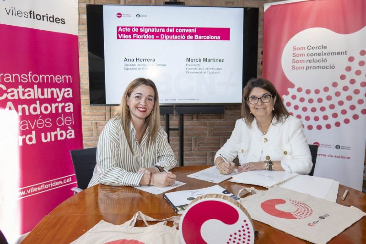 La diputada de Turisme de la Diputació de Barcelona, Ana Herrera, i la presidenta de la Confederació d’Horticultura Ornamental de Catalunya (CHOC), Mercè Martínez Martínez, en representació de la iniciativa Viles Florides, han signat dijous 30 d'octubre a Barcelona un conveni amb l’objectiu de treballar conjuntament per promocionar i crear experiències turístiques potenciades pels espais verds i enjardinats. Un total de 75 municipis de 12 comarques barcelonines formen part actualment de la iniciativa.