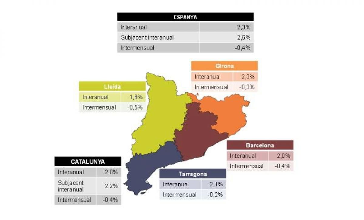 En termes de variació interanual, l’increment a Catalunya continua per sota del d’Espanya (2,0% i 2,3%, respectivament). La inflació subjacent se situa a Catalunya quatre dècimes per sota la que registra Espanya (2,2% i 2,6%, respectivament).